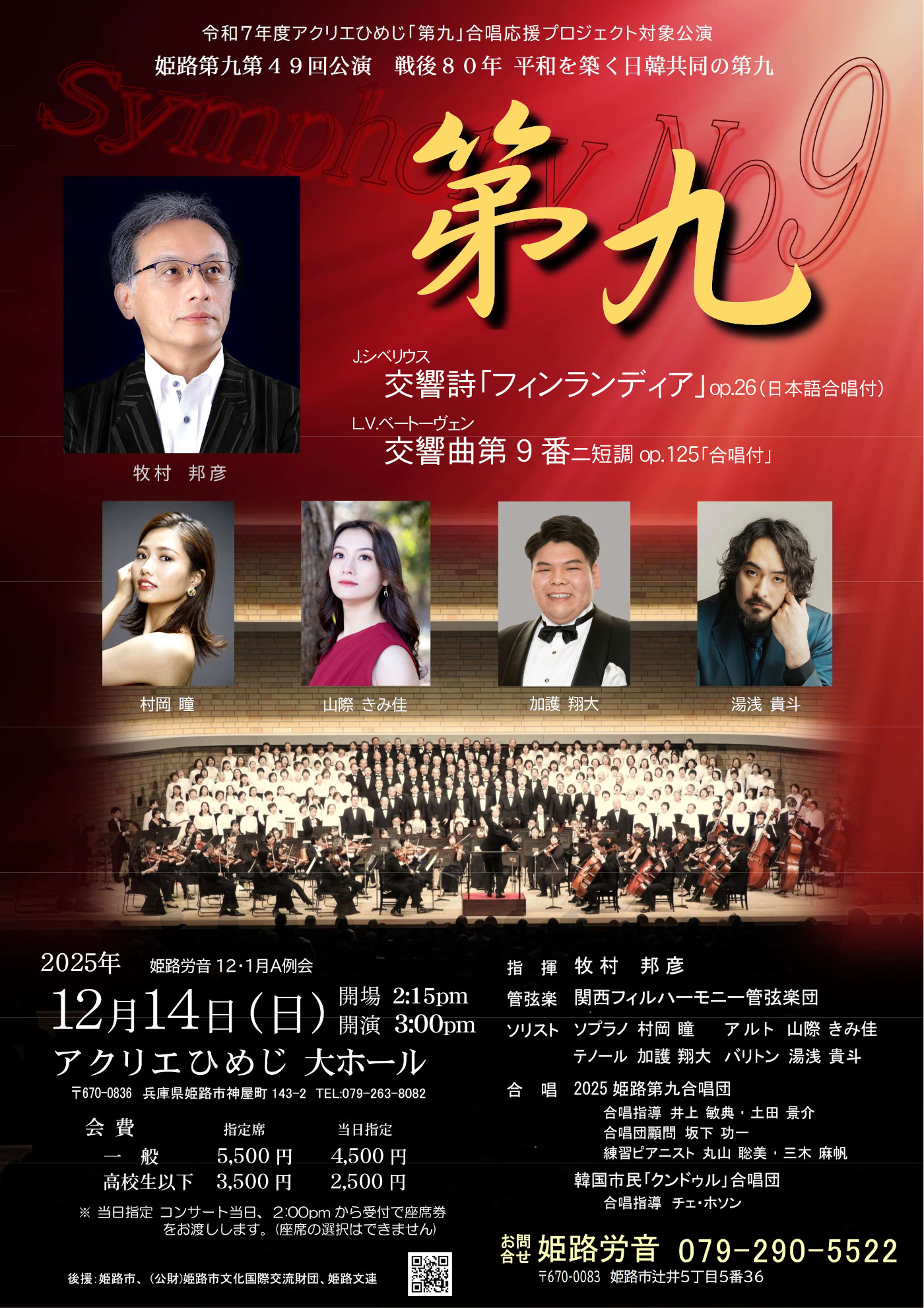 12月142025 例 会 第九 ベートーヴェン 交響曲第九番 L.V.ベートーヴェン 交響曲第九番 ニ短調 op.125 指 揮:牧村邦彦 弦楽:関西フィルハーモニー管弦楽団 ソプラノ:村岡 瞳 アルト :山際 きみ佳 テノール:加護 翔大 バリトン:湯浅 貴斗 合 唱:2025姫路第九合唱団 日 時2025年12月14日(日) 開場 2:15pm 開演 3:00pm 会 場アクリエひめじ 大ホール 会 費一 般 5,500円 高校生以下 3,500円 お問合せ姫路労音 Tel 079-290-5522